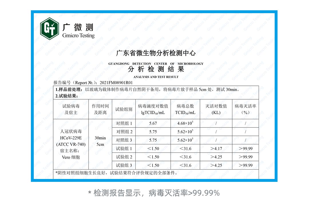 檢測結果顯示,百歐森光等離子殺菌模塊對于人冠狀病毒(HCoV-229E)的滅活率在99.99%以上,滅活人冠狀病毒效果顯著。