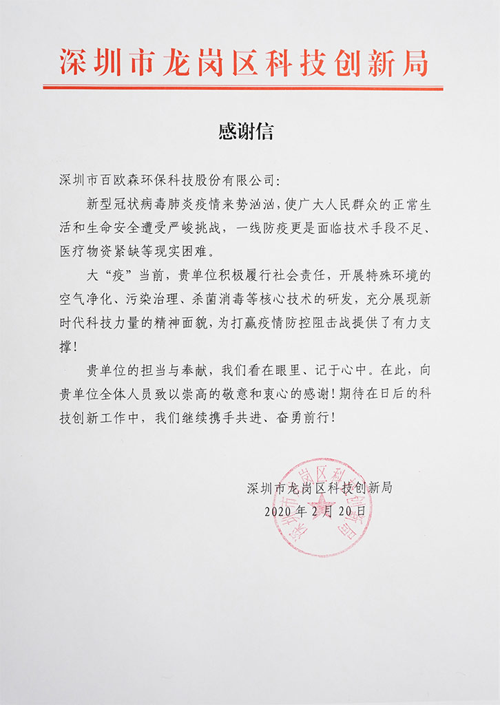 疫情期間,百歐森通過龍崗區科技創新局對龍崗區衛生健康局捐贈了一批價值消毒凈化器。